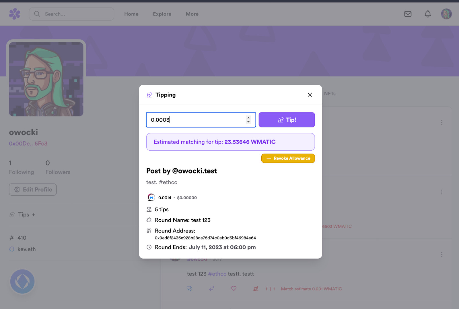 After contributions are made, users can see the accumulated tips and corresponding matching amounts on each post.